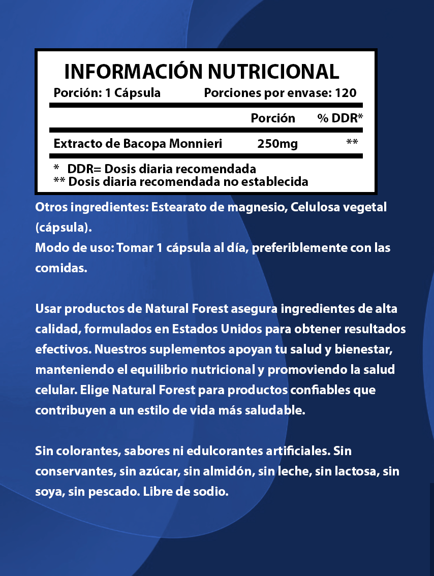 Bacopa Monnieri de Natural Forest es tu aliado natural para mejorar la memoria, el enfoque y el bienestar mental. Incorpóralo a tu rutina diaria y experimenta sus beneficios para la salud cognitiva.