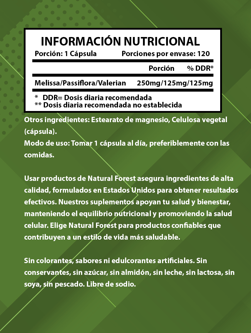 Descubre la tranquilidad natural con Nature's Calm de Natural Forest. Nuestro suplemento está cuidadosamente formulado con una mezcla sinérgica de extractos herbales de melisa, pasiflora y valeriana, plantas reconocidas por sus propiedades relajantes y calmantes. Diseñado para apoyar tu bienestar mental y promover un estado de relajación profunda, Nature's Calm es la opción ideal para quienes buscan manejar el estrés diario, aliviar la ansiedad y mejorar la calidad del sueño de manera natural.