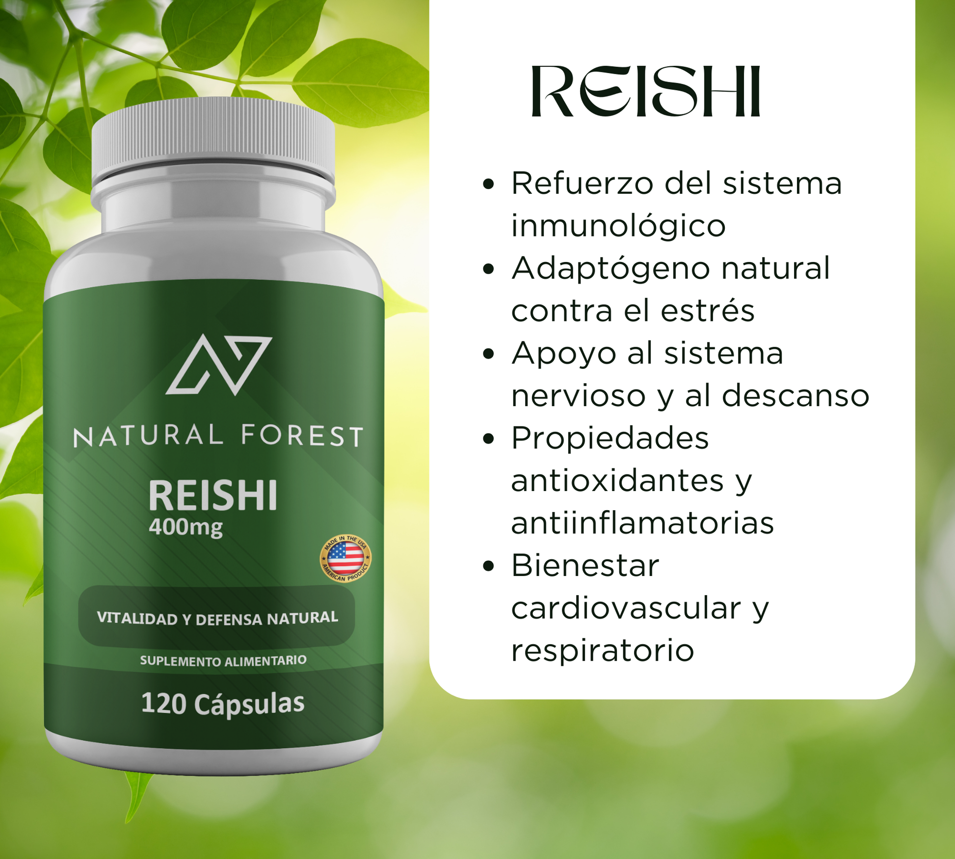 Natural Forest presenta su suplemento de Reishi (Ganoderma lucidum), un hongo funcional milenario conocido como “el hongo de la inmortalidad” en la medicina tradicional china y japonesa. Cada cápsula contiene 400 mg de extracto puro de Reishi, cuidadosamente seleccionado y cultivado bajo estándares de calidad para ofrecer sus múltiples beneficios en una fórmula práctica de uso diario.