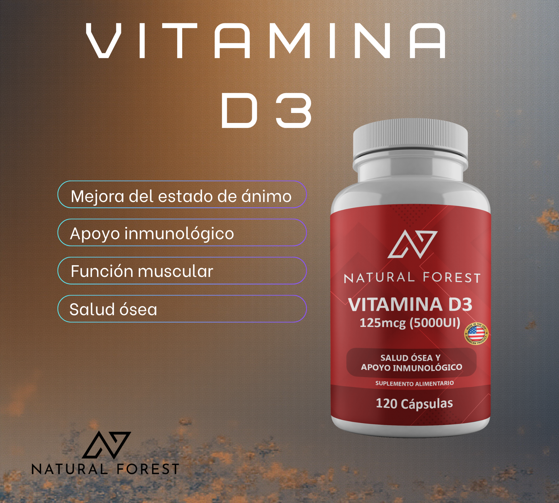Apoya tu salud integral con Vitamina D3 5.000 UI, elaborada con ingredientes de alta calidad en los Estados Unidos. La vitamina D3, también conocida como colecalciferol, es esencial para el correcto funcionamiento del cuerpo, ya que regula la absorción de calcio y fósforo, fortalece el sistema inmunológico y favorece la salud general.